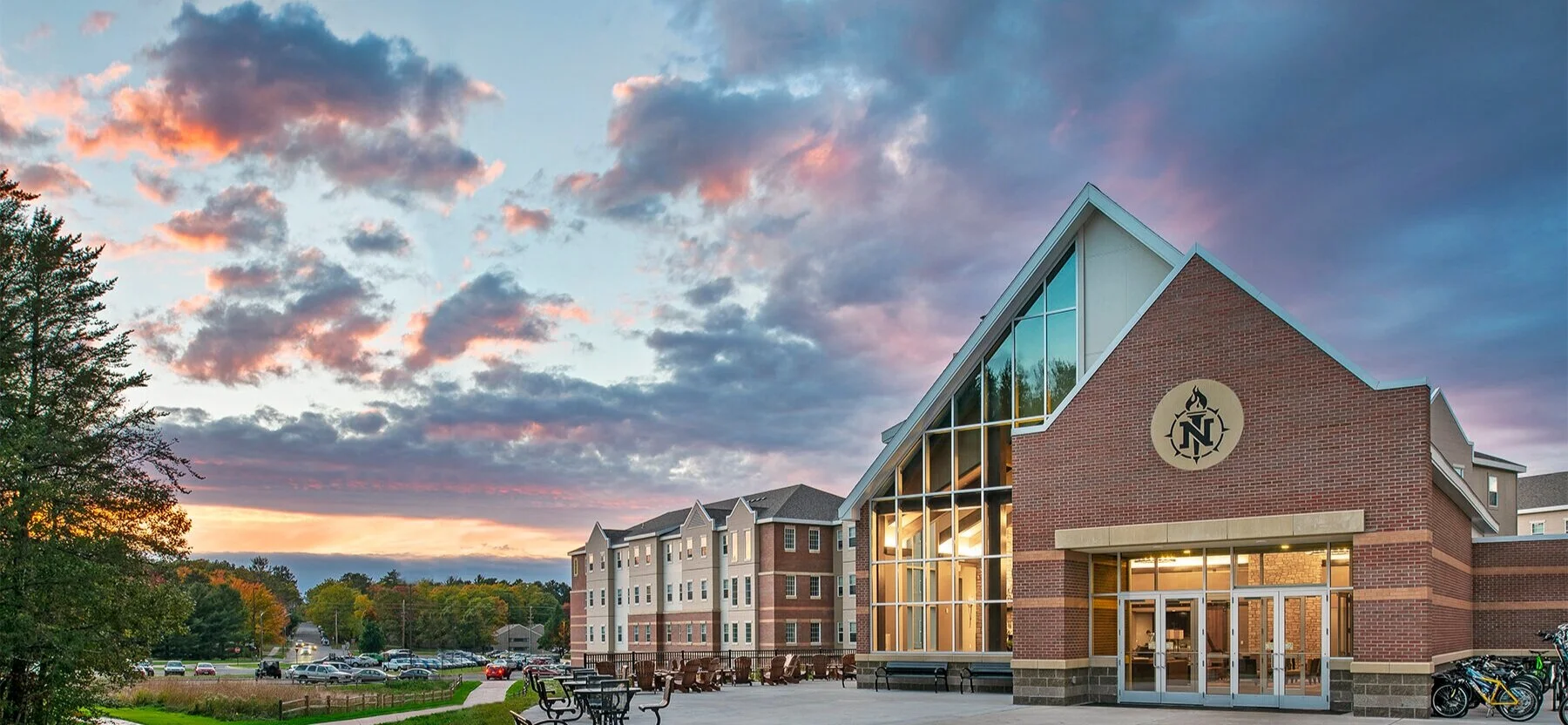 With the impact of weather being a constant consideration for NMU, the design of the buildings incorporated an enclosed pedestrian connection between each building allowing student to move between all residence halls and the dining facility without ever having to leave the protection of enclosed spaces. Taking advantage of the connections, the project used a centralized boiler system to pipe heated water throughout the entire six-building complex using tunnels under the building connectors. In addition to office space, some of the buildings incorporated classrooms and a tutoring center. A grand lodge for student and faculty gatherings presented the perfect venue for a patio overlooking the protected environmentally sensitive planting area that was a hallmark of the student sustainability program.